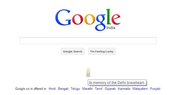 Google India homepage now features a candle light just below the search box with a hover text saying “In memory of the Delhi braveheart“. Google India has also gone to their official Google plus page to express tribute to the Delhi brave heart. In its post Google India says “Saluting the courage and fortitude of the Delhi brave heart. Our humble tribute.“