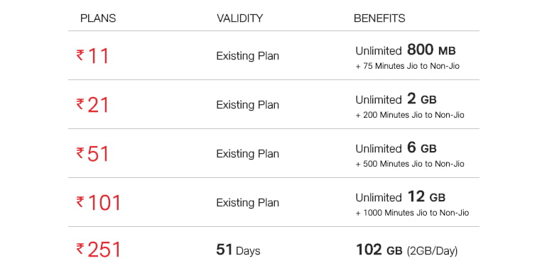 The revised 4G data vouchers of Rs 11, Rs 21, Rs 51 and Rs 101 now comes with 800 MB, 2 GB, 6 GB and 12 GB of pre-fup high-speed data. Along with data benefits, now this data vouchers also bundles Jio to Non-Jio voice minutes. Thus each of the above data vouchers now carries 75 minutes, 200 minutes, 500 minutes and 100 minutes of Jio to Non-Jio voice minutes. The validity of these data vouchers would be based on your existing Jio prepaid plans.